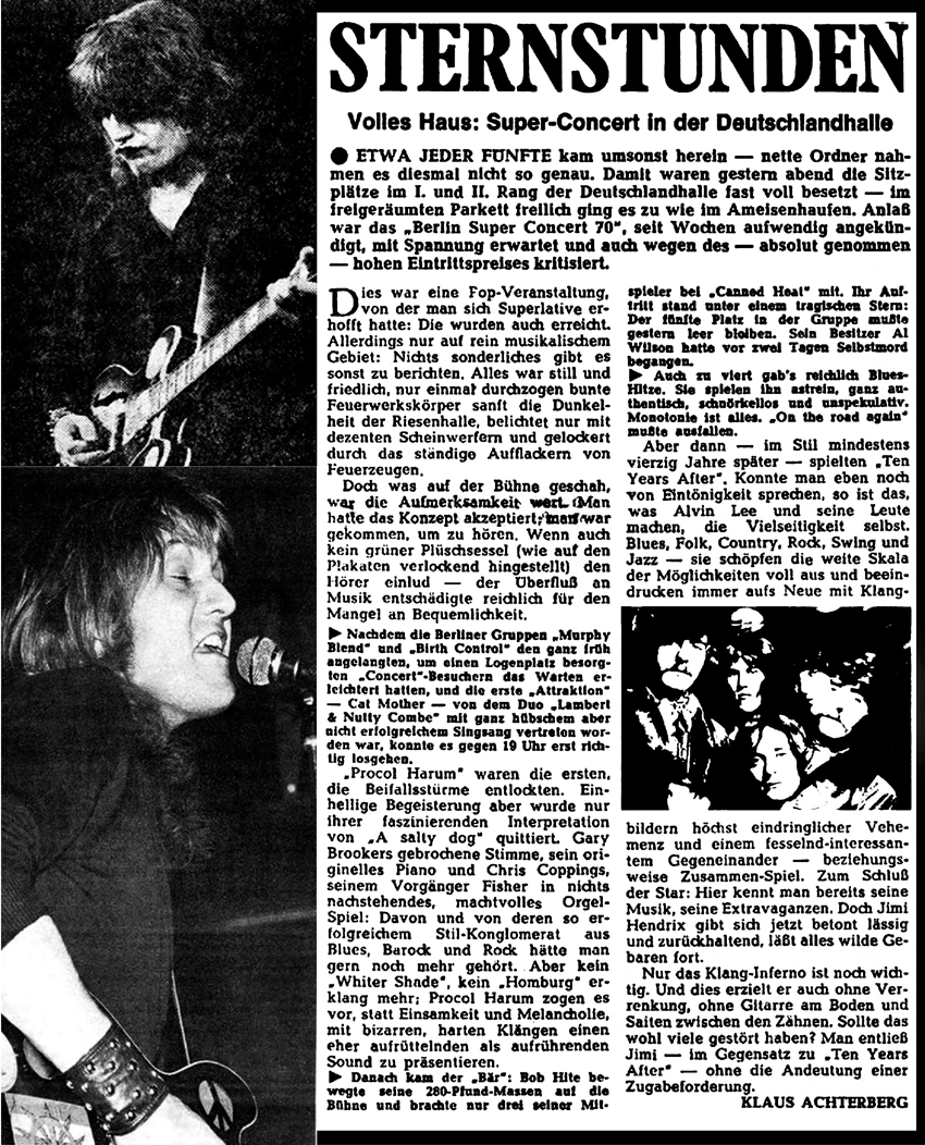 September 4, 1970 – Deutschland Halle in Berlin, Germany. This event was also promoted as the “Super Concert 70”. Also on the bill with Ten Years After were, Jimi Hendrix, Procol Harum, Canned Heat, Cat Mother, and Murphy Bland.
